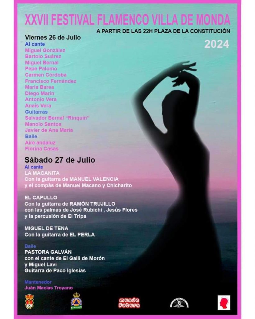 22.00 horas. Plaza de la Constitución. XXVII Festival de Monda. La Macanita, El Capullo de Jerez y Miguel de Tena, al cante, Manuel Valencia, Ramón Trujillo y El Perla, a la bajañí, y Pastora Galván y su cuadro, al baile. Presenta Juan Macías Troyano.