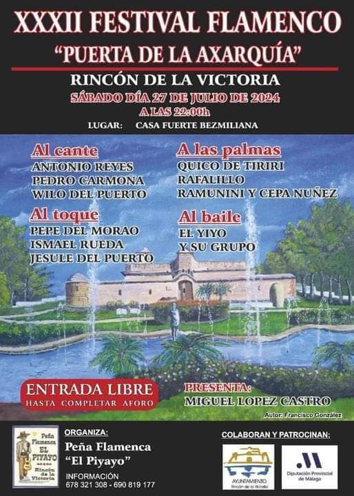 22.00 horas. Casa Fuerte Bezmiliana de Rincón de la Victoria. XXXII Festival Puerta de la Axarquía. Antonio Reyes, Pedro Carmona y Wilo del Puerto, al cante, Pepe del Morao, Ismael Rueda y Jesule del Puerto, a la guitarra, Quico de Tiriri, Rafalillo Habichuela, Ramunini y Cepa Núñez, a las palmas, y El Yiyo y su cuadro, al baile.
