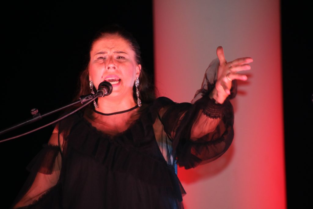 Estuvo muy bien arropada por Juan Requena, al toque, y Manuel de la Curra y José Manuel Fernández, al cante y compás. Abrió con una canción por rumbas («Navegaré por el mar de la tristeza…»), compuesta por Requena, que sonó a gloria bendita en su flamenquísima voz y con los coros también flamenquísimos de De la Curra y Fernández.