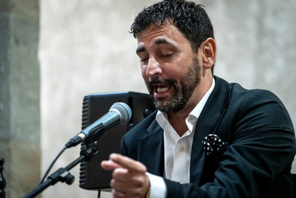 Antonio Agujetas Chico y Domingo Rubichi comenzaron por tientos en la calurosa y lluviosa tarde del 27 de agosto en el Civivox Condestable. «Viva la lluvia y viva el bochorno», espetó el jerezano nada más comenzar. Tuvo que quitarse la chaqueta al terminar el primer cante. El patio, repleto de gente, sillas ocupadas, alrededor en pie, asomadas en la primera y segunda planta. Antonio, que recuerda su estirpe en sus formas: su forma de entonar los cantes, de arrancarse, su forma de mover el cuerpo, incluso cerrando los ojos se acuerda de dónde viene.