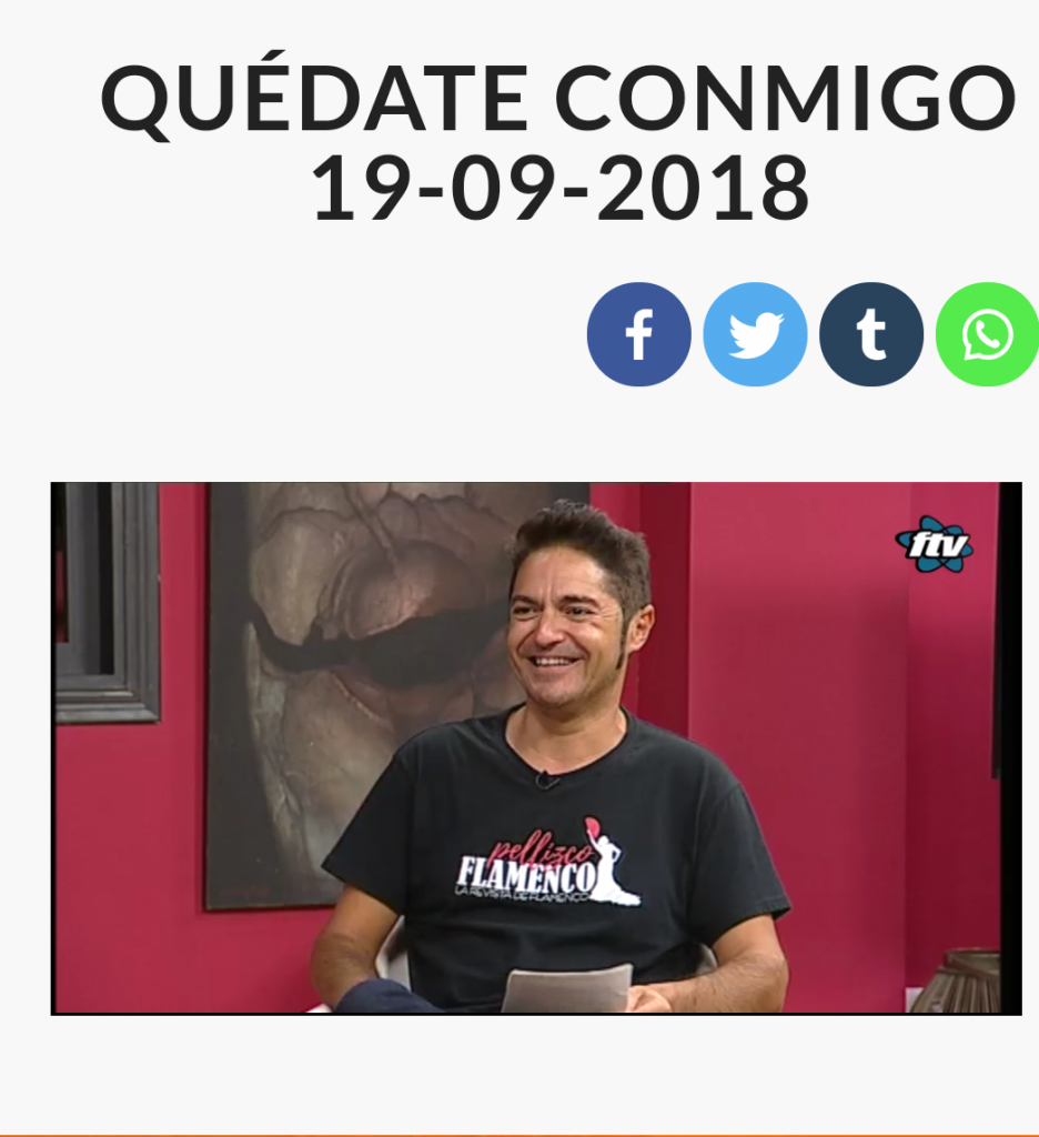 Francisco Reina, editor de la Revista Pellizco Flamenco, despidió anoche su sección sobre flamenco en el programa ‘Quédate conmigo verano’, que conduce Pedro Espín en Fuengirola TV, de la mano de Mariló Galdeano. En ella abordó la Noche Flamenca de la quincuagésima edición de la Fiesta del Ajoblanco de Almáchar, con Samuel Serrano y Lole Montoya como protagonistas.