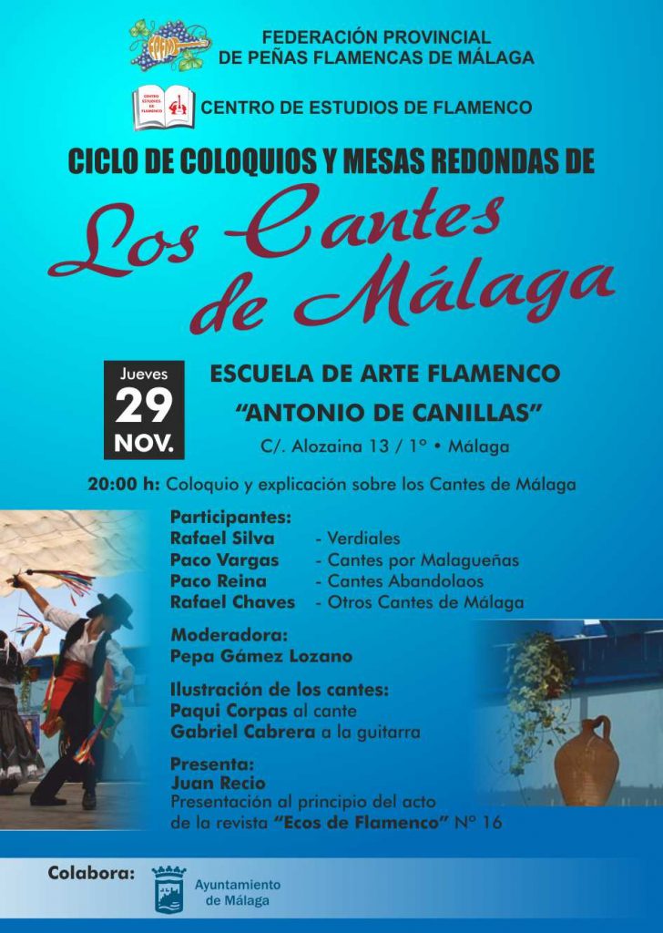 Reina disertará sobre los abandolaos; Rafael Silva, sobre los Verdiales; Paco Vargas, en torno a las malagueñas; y Rafael Chaves hablará sobre otros cantes de Málaga. Todo ello ilustrado con el cante de Paqui Corpas y el toque de Gabriel Cabrera. La cita es el jueves 29 de noviembre en la Escuela de Flamenco Antonio de Canillas (C/ Alozaína, 13 – 1 Málaga) a las 20.00 horas.