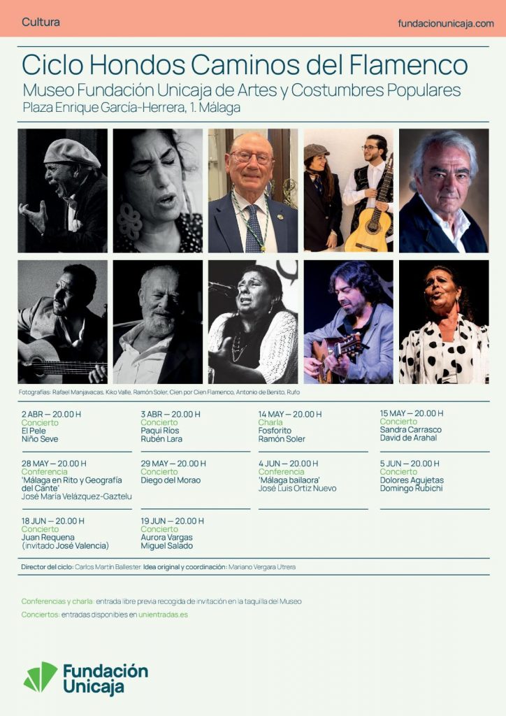 Fundación Unicaja pone en marcha la segunda edición del ciclo ‘Hondos Caminos del Flamenco’ que llevará al Museo Fundación Unicaja de Artes y Costumbres Populares de Málaga a artistas como Fosforito, Aurora Vargas, El Pele, Dolores Agujetas, Sandra Carrasco o Diego del Morao, y expertos como José María Velázquez-Gaztelu o José Luis Ortiz Nuevo, entre otros. El Pele, el día 2 de abril, y Paqui Ríos, al día siguiente, abrirán la cita malagueña.