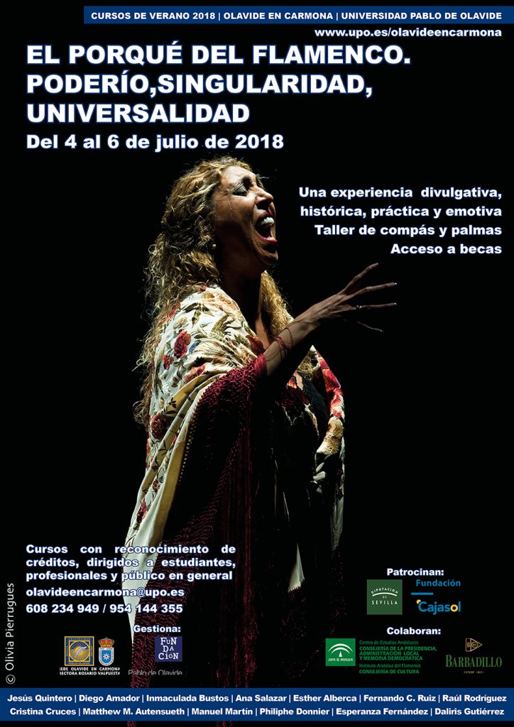 La Universidad Pablo de Olavide de Sevilla ofrece, como cada año, dentro de su oferta formativa de verano un curso específico de flamenco (‘El porqué del flamenco. Poderío, singularidad, universalidad’), que tendrá lugar en Carmona del 4 al 6 de julio. Entre los participantes, destaca la presencia de Esperanza Fernández, en la clausura, con Daliris Gutiérrez, y de Diego Amador. La inauguración correrá a cargo de Jesús Quintero.