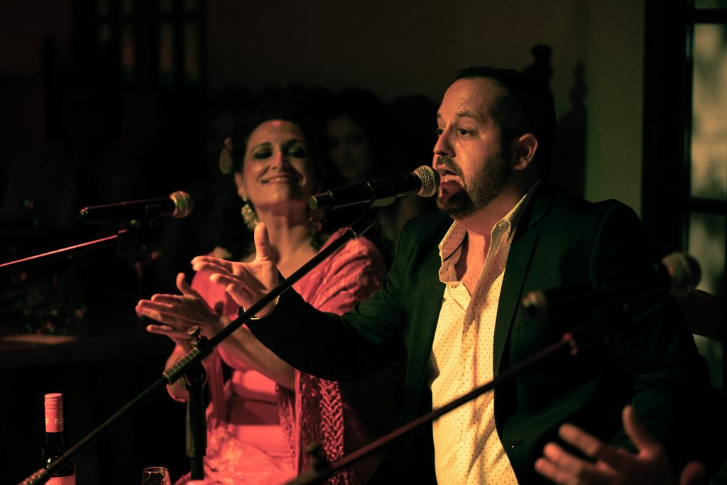 Se levanta Alfonso Carpio y, de pie, nos trae unas bulerías de Jerez; cante que domina a la perfección. A las palmas le acompañan Laura y Alejandro. Sin tregua, la voz flamenca de la cantaora malagueña afincada en Sevilla aporta unos tangos: “Quien dice Andalucía// hay que pensar en la gloria.// Quien dice Andalucía// se me grabó en la memoria// que mi mare me decía// Andalucía tiene historia”. Se arranca a bailar y se acerca al respetable cantando sin micro.