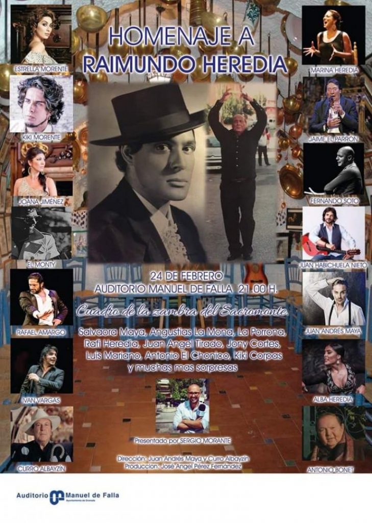 Raimundo Heredia, bailaor granadino que en septiembre cumplirá ochenta primaveras, recibirá este sábado, 24 de febrero, un multitudinario homenaje en el auditorio Manuel de Falla de Granada. Estrella Morente, Marina Heredia y Rafael Amargo encabezan un cartel que también componen: Curro Albaicín y Juan Andrés Maya, que dirigen el espectáculo, Jaime Heredia El Parrón, Fernando Soto, Joana Jiménez y Juan Habichuela Nieto, entre otros.