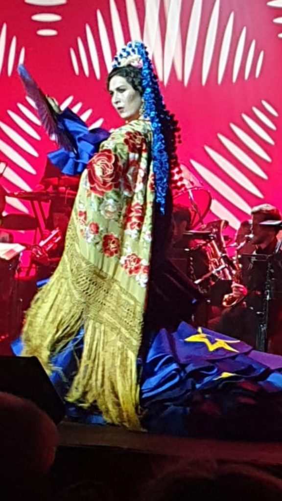 El público se rindió ante su demostración de puesta en escena y calidad, que interpretó acompañada por una banda de música, cantando de pie y moviéndose por el escenario con bata de cola y complementos como abanico y mantón.