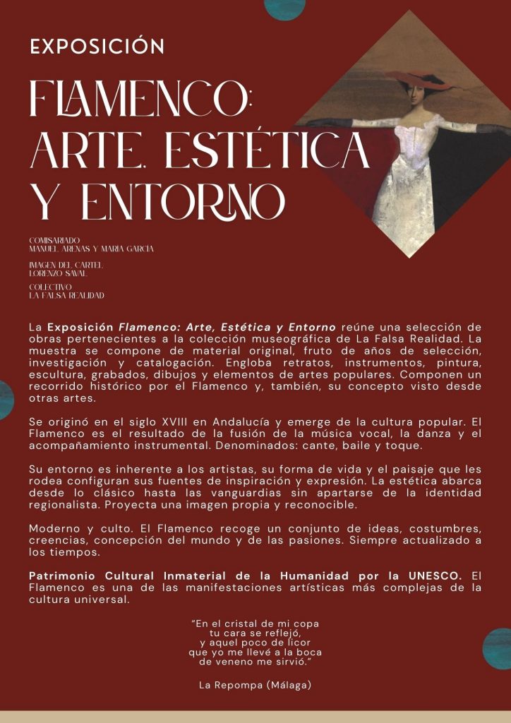 La muestra reúne una selección de obras pertenecientes a la colección museográfica de La Falsa Realidad. Se compone de material original, fruto de años de selección, investigación y catalogación. Engloba retratos, instrumentos, pintura, escultura, grabados, dibujos y elementos de artes populares. Componen un recorrido histórico por el flamenco y también su concepto visto desde otras artes.