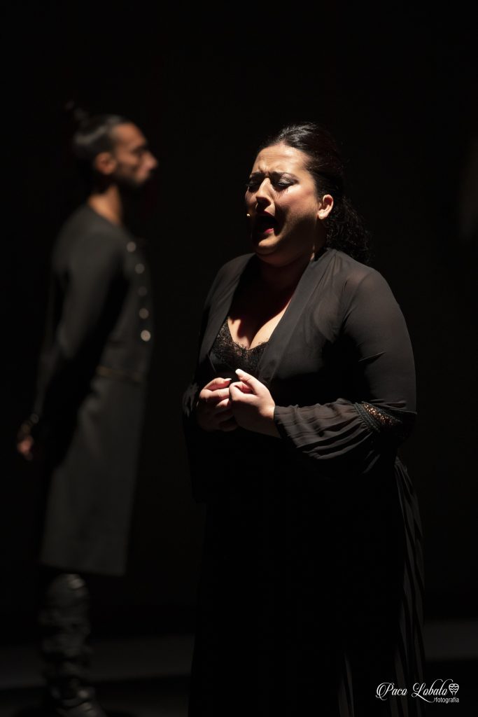 En los aledaños del teatro, un desfile procesional extraordinario se perfila junto a la plaza de bienvenida. Hay afluencia de público y cámaras fotográficas por doquier. Ante mí la imagen de un ‘Ecce-Homo’ que se me aparece sorpresivamente. Es el Señor de la Humildad y parece que ni hecha a posta la escena. Imagino que la contextualización no podía ser más adecuada para atravesar a través de un hilo fluyente puertas adentro y culminar en el transcurso de los minutos siguientes el primer número con la pasión doliente de las saetas. Una presagio doliente.