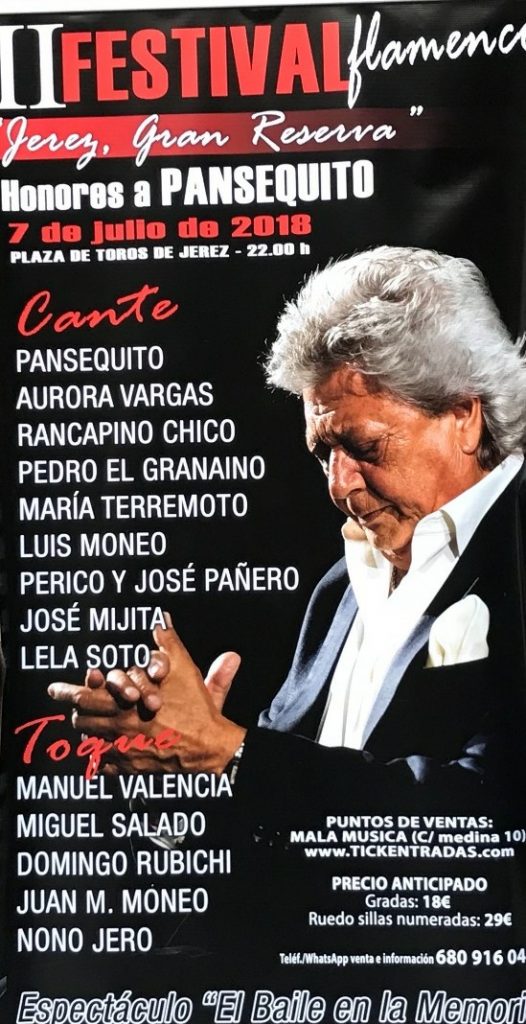 El II Festival Flamenco Jerez Gran Reserva, que en su primera edición estuvo dedicado al malogrado Moraíto, homenajeará a Pansequito. La cita será el 7 de julio en la plaza de toros de Jerez. Junto al homenajeado, actuará su pareja artística y vital, Aurora Vargas, y otros destacados artistas del panorama jondo, como Rancapino Chico, Pedro El Granaíno y María Terremoto.