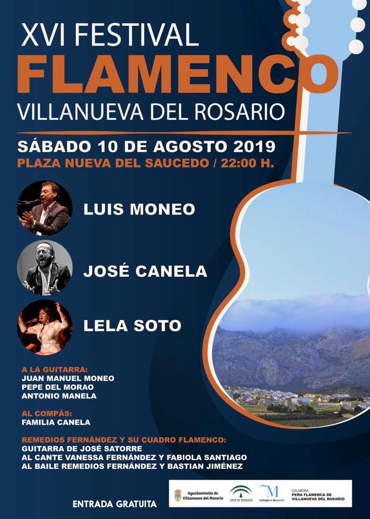 José Canela, hijo del gran Canela de San Roque, Luis Moneo, hermano de los añorados El Torta y Manuel Moneo, y Lela Soto, hija de Vicente Soto, acompañados por Pepe del Morao, Juan Manuel Moneo y Antonio Manela, respectivamente, al toque, componen el cartel del XVI Festival Flamenco de Villanueva del Rosario. El baile lo pondrá Remedios Fernández y su cuadro (Vanessa Fernández y Fabiola Santiago, al cante; José Satorre, a la guitarra; y Bastián Jiménez, también al baile).