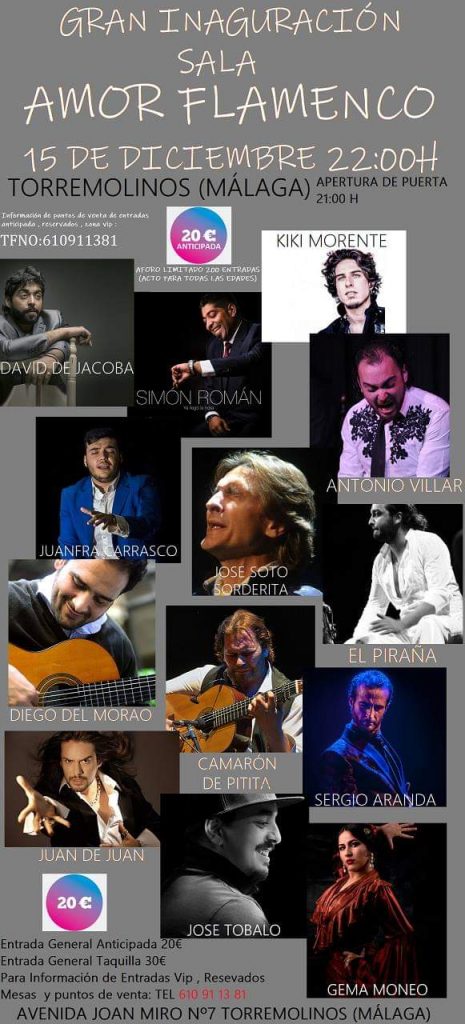 La inauguración de la sala Amor Flamenco en Torremolinos concitará la presencia de una pléyade de figuras de lo jondo, tales como Kiki Morente, Diego del Morao y Juan de Juan, amén de José Soto Sorderita, David de Jacoba y Gema Moneo, entre otros. La cita es el 15 de diciembre en la citada localidad malagueña.