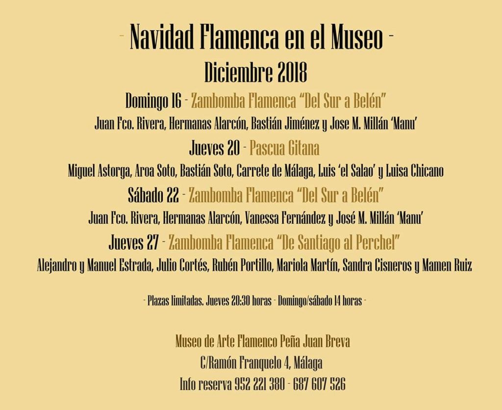 La Peña Flamenca Juan Breva de Málaga acoge esta Navidad cuatro zambombas flamencas, los días 16 (‘Del Sur a Belén’), 20 (‘Pascua gitana’), 22 (‘Del Sur a Belén’) y 27 de diciembre ( ‘De Santiago al Perchel’), en el Museo de la entidad.