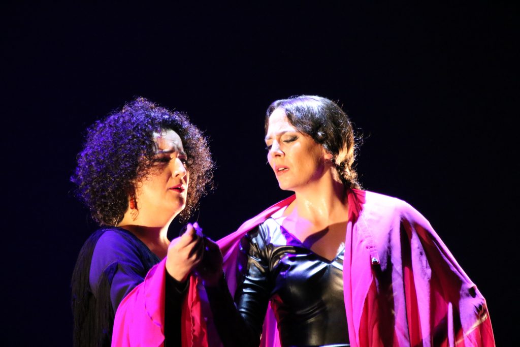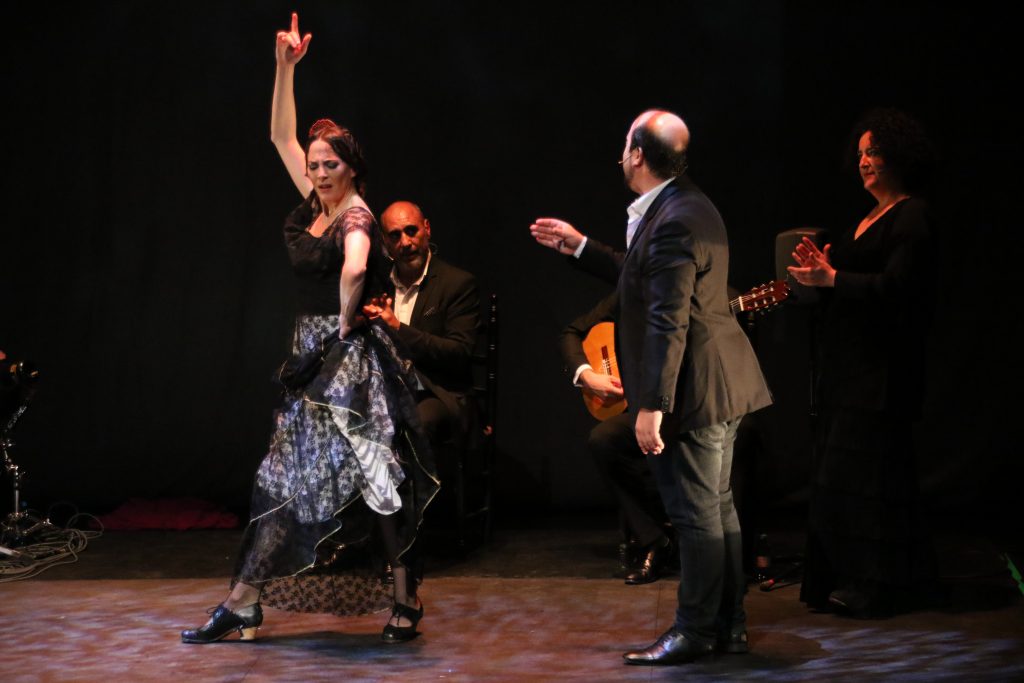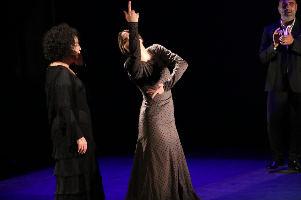 Y de la fiesta a la solemnidad de la petenera, con La Lebri pellizcando, los ayeos de la caña para rematar y la soleá. Sumamente original. La Piñona lo da todo en el escenario y pellizca con sus remates y desplantes. En la despedida, el garrotín, cierre original y festivo, diferente al habitual fin de fiesta por bulerías.