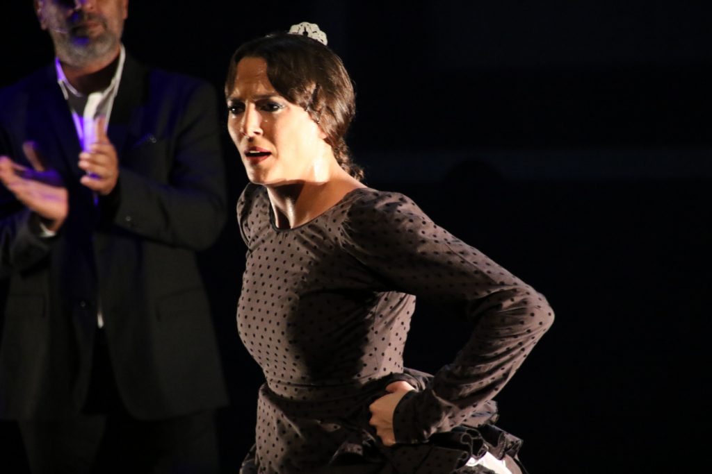 A solas con Javier Teruel a la percusión, conmueve con su baile, en el que introduce elementos de danza contemporánea, antes de dar paso -ya con la guitarra de Francisco Vinuesa, sobre el que recae el peso musical de la obra, y el cante- a los tarantos rematados por tangos, con una falda que convierte en capa y mantón.