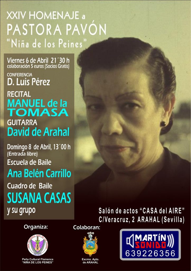 El XXIV Homenaje a Pastora Pavón, Niña de Los Peines, organizado por la peña flamenca de Arahal, localidad natal de la madre de la mítica cantaora sevillana, a la que estuvo vinculada por tal motivo, cuenta con la actuación de Manuel de la Tomasa, joven cantaor revelación, nieto de José de la Tomasa, el 6 de abril; y el baile de Susana Casas y Ana Belén Carrillo, el 8 de abril.