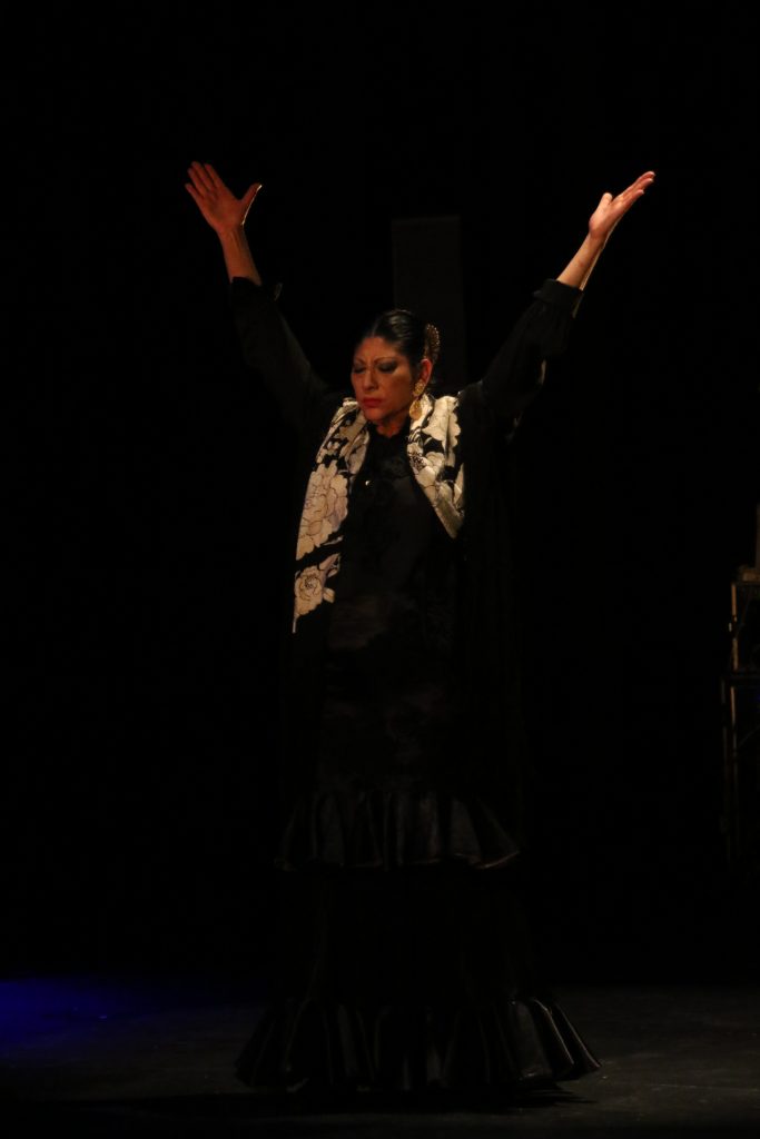 Manuela hace su aparición, brazos en alto y con mantón. Pellizca con su elegante braceo y su taconeo de arte por tarantos. Se despide con el mantón a modo de capote.