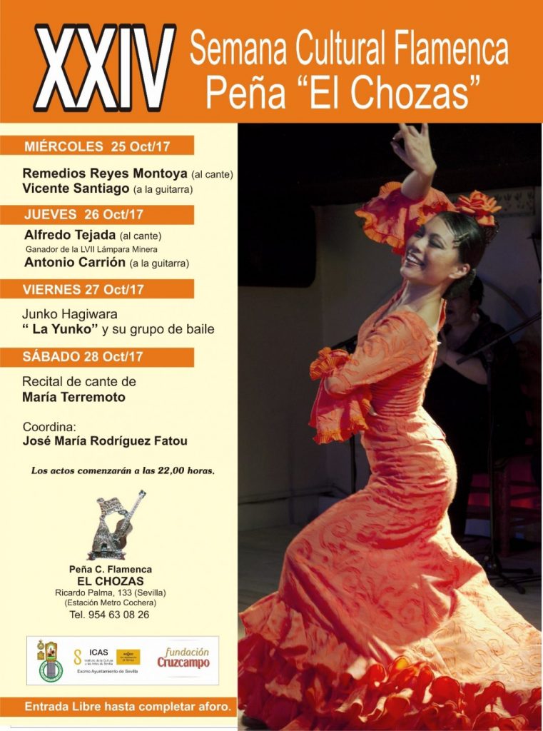 María Terremoto, hija de Fernando Terremoto y revelación del cante jerezano, y Alfredo Tejada, flamante Lámpara Minera 2017, son los cabezas de cartel de la XXIV Semana Cultural de la Peña Flamenca El Chozas de Sevilla, que se celebra del 25 al 28 de octubre.