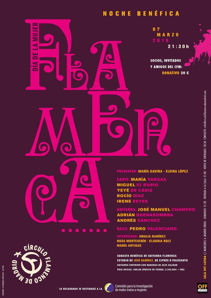 El Círculo Flamenco de Madrid organiza un festival benéfico, con motivo del Día de la mujer trabajadora, si bien lo celebra un día antes, el 7 de marzo, con María Vargas como cabeza de cartel. La cita es a las 21.30 horas.