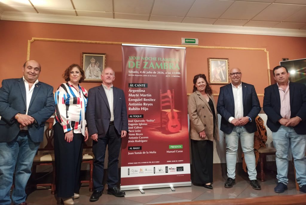 Entre el público hubo una amplia representación de peñas cordobesas: Rute, Lucena, Sotogordo, Encinas Reales, y las malagueñas de Teba, Riogordo y Colmenar. Oculto con un manto se encontraba el cartel de 2026 y cuando fue despojado de este cubrimiento, quedaron por fin desvelados los artistas que participarán en la XXXII Noche Flamenca de Zambra. Por este orden, pudimos ver los nombres de Argentina que estará acompañada a la guitarra por José Quevedo Bolita y por Eugenio Iglesias; Mayte Martín y la sonanta de José Gálvez; Ezequiel Benítez, arropado por Paco León; Antonio Reyes, junto a su hijo Nono Reyes; y Rubito Hijo, que contará con su acompañante habitual Antonio Cáceres.