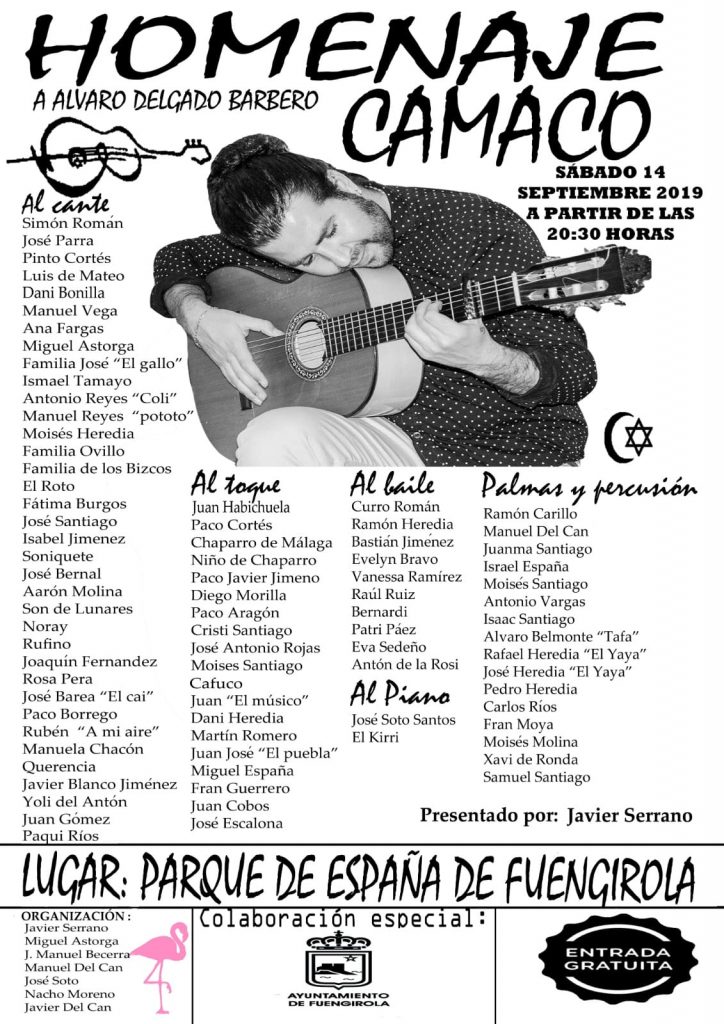 Álvaro Delgado Barbero, Camaco para el flamenco, fallecido el pasado 24 de julio, recibirá un multitudinario homenaje en Fuengirola. La cita, a la que acudirán infinidad de amigos del joven guitarrista fuengiroleño, es el sábado 14 de septiembre, a las 20.30 horas, en el Parque de España.