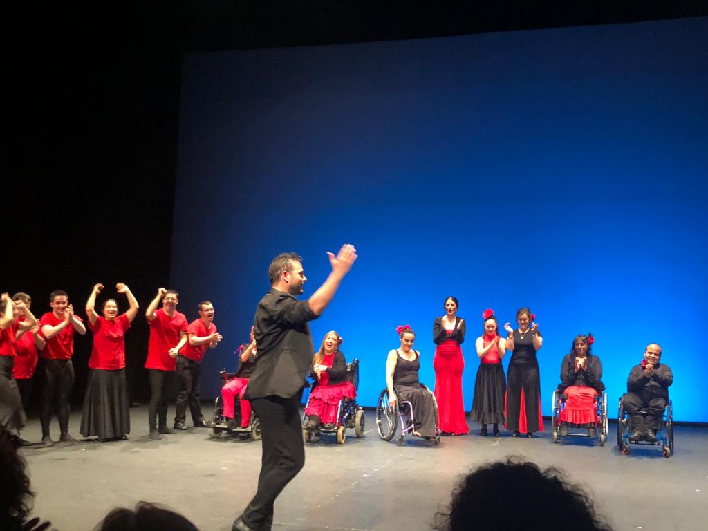 Una noche muy especial la que nos ofreció la compañía de José Galán, con su espectáculo de flamenco inclusivo ‘Sueños reales de cuerpos posibles’. Comienza la obra con iluminación y vestuario exclusivamente en rojo y negro, los colores del flamenco, con tres mujeres y un hombre en silla de ruedas y ocho bailarines con capacidades distintas y con una interesante propuesta artística estructurada en torno a cuatro palabras: sueños, reales, cuerpos y posibles.
