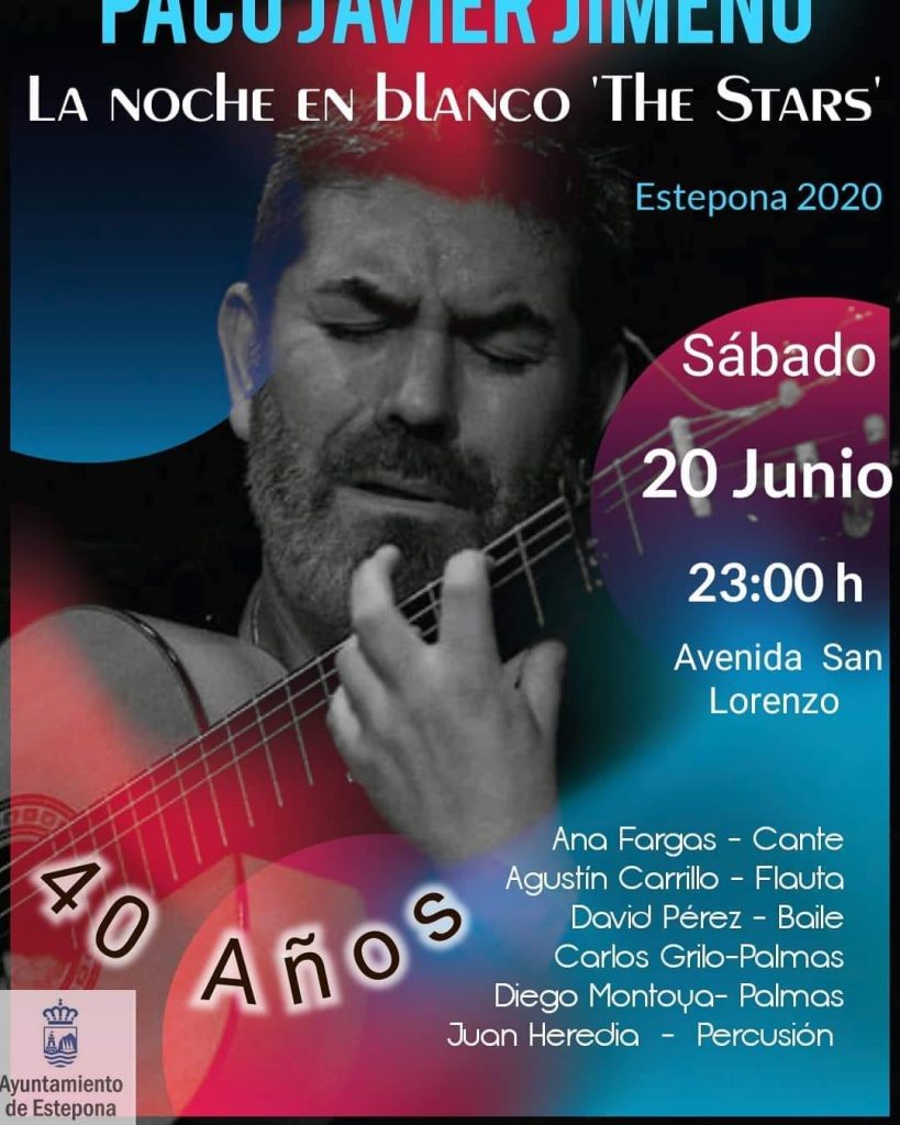 Paco Javier Jimeno celebra este sábado (23.00 horas) en su Estepona natal sus cuarenta años de carrera. La cita, enmarcada en La Noche en Blanco, es en la Avenida San Lorenzo con el aforo limitado a 400 asientos, siguiendo las indicaciones de las autoridades sanitarias.