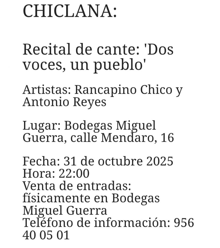 El mano a mano —bajo el epígrafe ‘Dos voces, un pueblo’— entre el hijo de Rancapino y Antonio Reyes será este viernes (22.00 horas) en las Bodegas Miguel Guerra. Juan Garrido ejercerá como maestro de ceremonias.