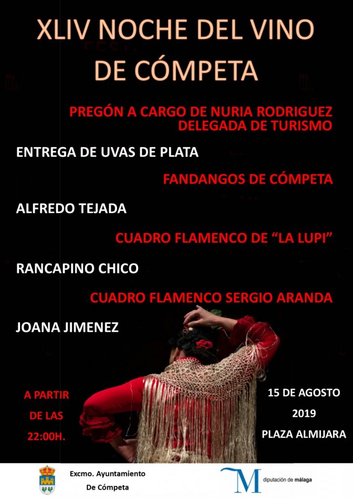 Cómpeta celebra su XLIV Noche del Vino con un cartel de lujo compuesto por Rancapino Chico y Alfredo Tejada, Lámpara Minera 2017, al cante; y algo poco frecuente, dos cuadros de baile, los de La Lupi y Sergio Aranda; amén del grupo de Fandangos local. La guinda la pondrá Joana Jiménez. La cita es esta noche, a partir de las 22.00 horas, en la Plaza Almijara.