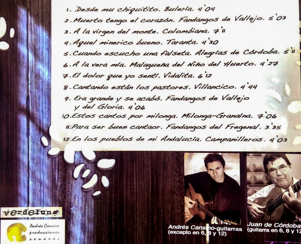 Andrés Cansino dirigió la producción en su estudio para poder imprimirle un aire actual y elaborado, además de poner su guitarra en nueve cortes del álbum y reflejar así la larga trayectoria de actuaciones que ha tenido junto a la cantaora desde que se iniciaron en la escuela de cante que dirigía José Baena Romero en la extinta Peña El Jabegote-Juan de la Loma de Fuengirola. Juan de Córdoba es el otro guitarrista que acompaña a Paqui en el álbum, concretamente en tres temas (Malagueña del Niño del Huerto, fandangos de Vallejo-El Gloria y Campanilleros).