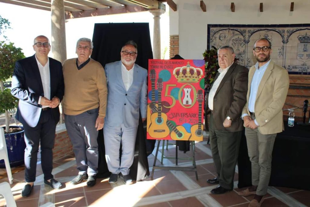 El cartel fue presentado ayer por el alcalde, Joaquín Villanova; el concejal de Actividades en El Portón y Grandes Eventos, Andrés García; el presidente de la Peña Torre del Cante, Antonio Donaire; y el presentador del Festival, Gonzalo Rojo.