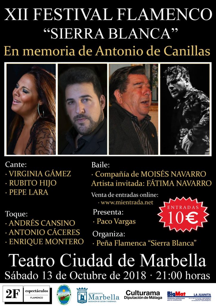 Virginia Gámez y Rubito Hijo encabezan el cartel del XII Festival Flamenco Sierra Blanca de Marbella, que completa el cantaor local Pepe Lara, acompañados al toque por Andrés Cansino, Antonio Cáceres y Enrique Montero, respectivamente. El baile lo pondrá Moisés Navarro, con Fátima Navarro como artista invitada. Paco Vargas ejercerá como maestro de ceremonias. La cita es el 13 de octubre en el Teatro Ciudad de Marbella.