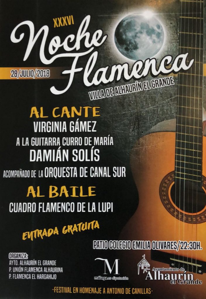 Virginia Gámez, con la guitarra de Curro de María; Damián Solís, con la Orquesta de Canal Sur; y el cuadro flamenco de La Lupi conforman el cartel de la XXXVI Noche Flamenca de Alhaurín El Grande, que homenajea al añorado Antonio de Canillas. La cita es el próximo sábado, 28 de julio. Previamente, se celebrará un flashmob flamenco por sevillanas y una presentación y degustación de vinos finos y manzanillas.
